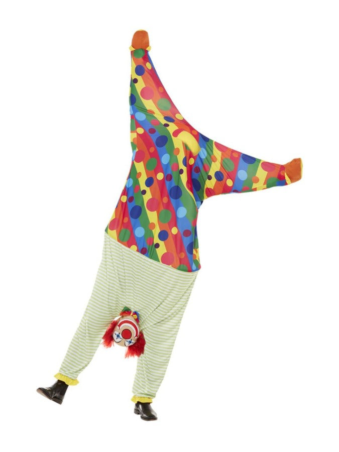 Our Upside Down Clown Costume includes this all in one costume which has a spot & stripe top half with pretend feet on the end of each sleeve. The bottom half of the costume has a green and white stripe throughout and a clown head in the crotch area to make it look as if your upside down.