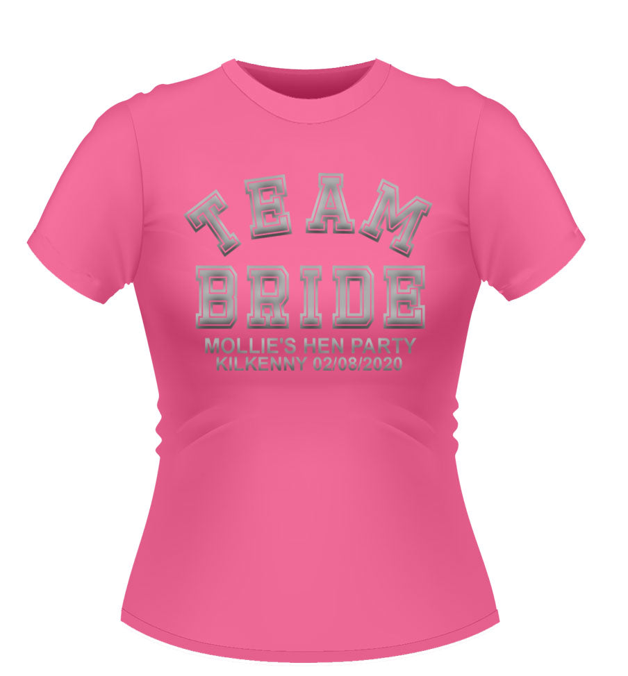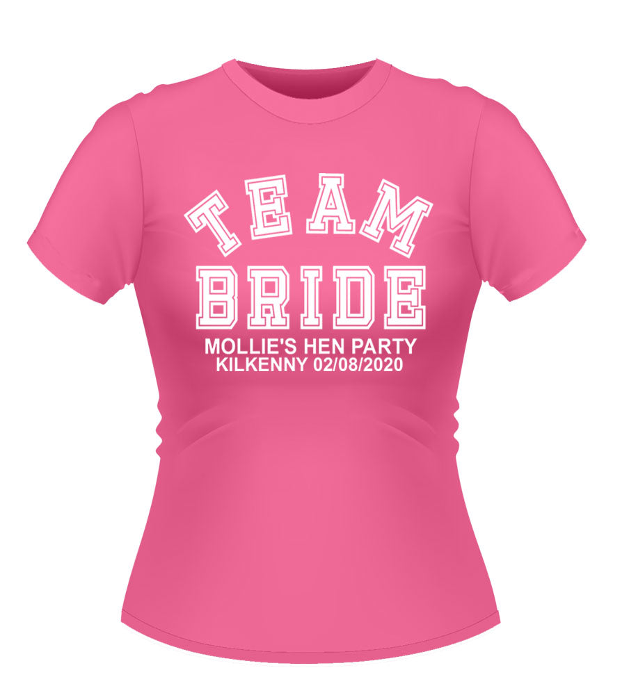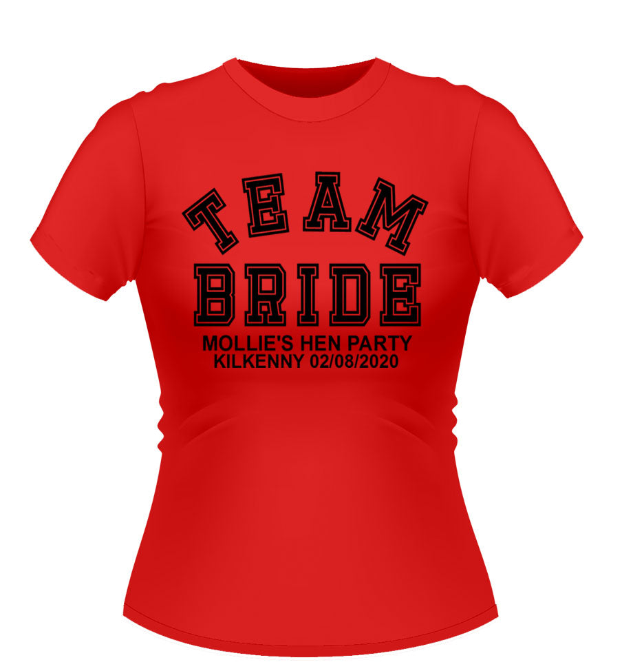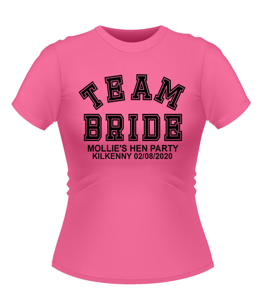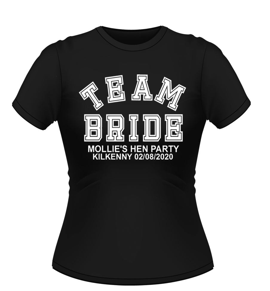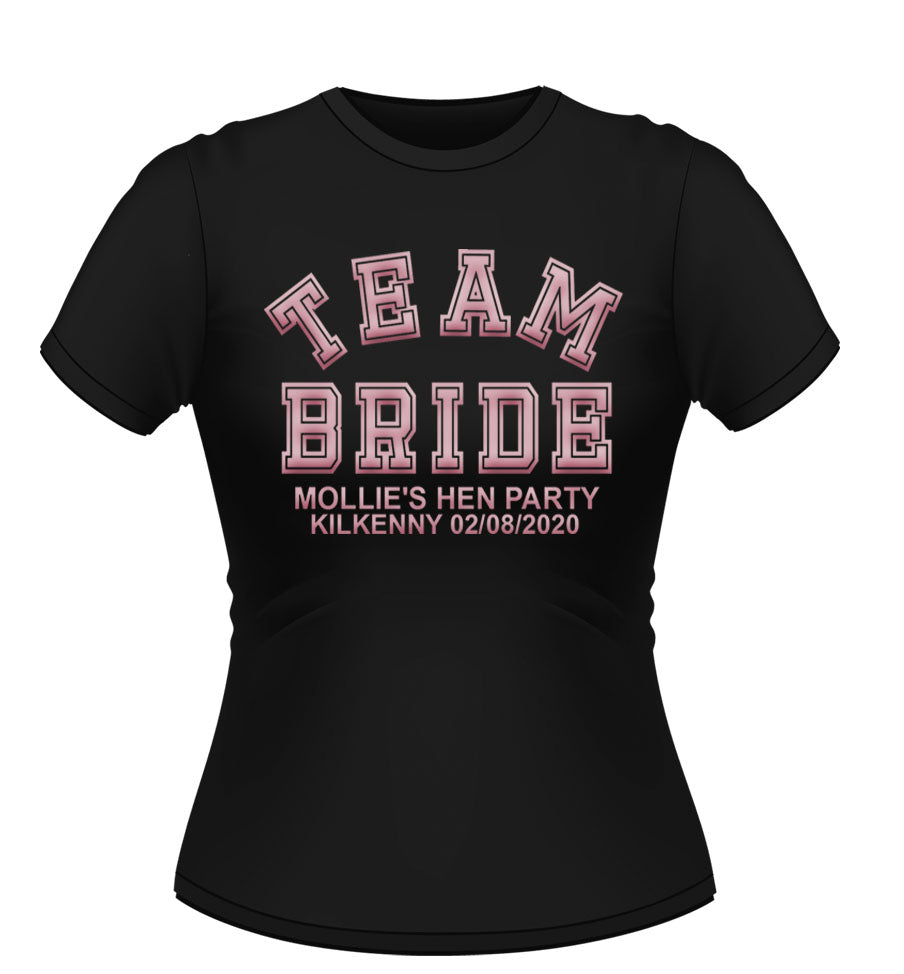 'TEAM BRIDE' Personalised T-shirt available in a variety of colours and sizes. XXL and Plus size available.