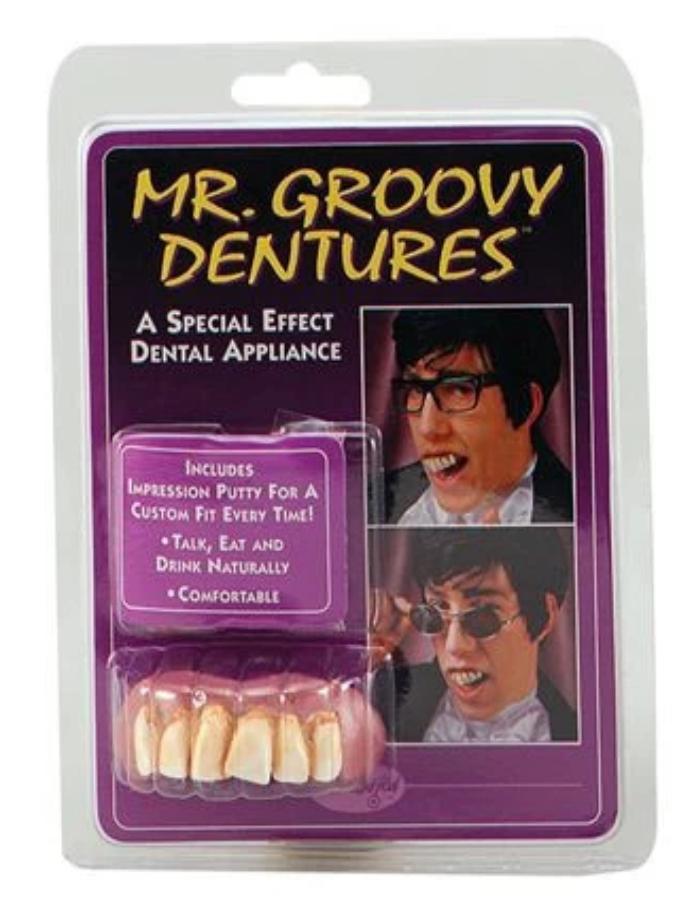 Mr Groovy Dentures for Austin Powers outfits.Includes impressionj putty for a custom fit everytime! Talk, eat and drink naturally. Comfortable to wear.
